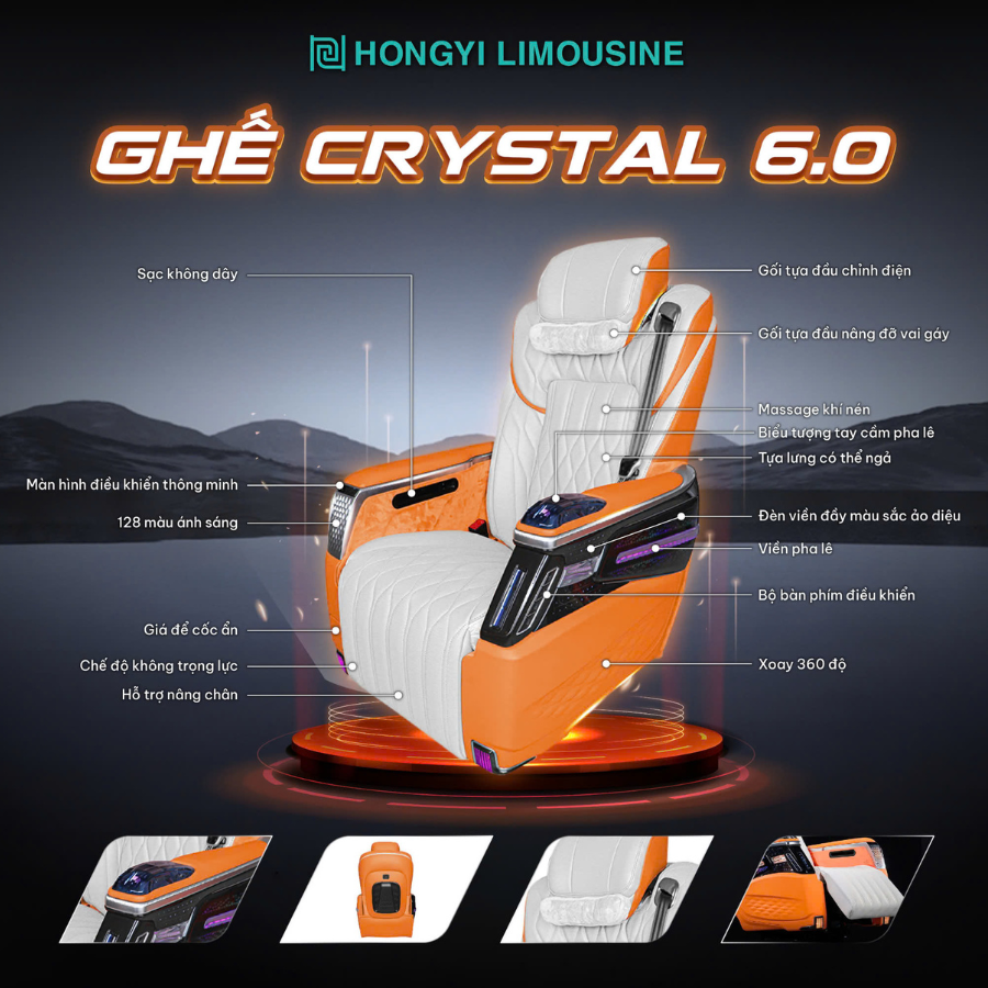 Ghế Limousine Hongyi Crystal 6.0 là lựa chọn lý tưởng cho những chủ xe yêu cầu cao về trải nghiệm và thẩm mỹ nội thất. Với thiết kế sắc sảo, chất liệu cao cấp cùng công nghệ hiện đại, Crystal 6.0 mang đến cảm giác thoải mái tối đa trong từng khoảnh khắc di chuyển. Ghế được trang bị loạt tính năng nổi bật như xoay 360 độ linh hoạt, chỉnh điện đa hướng và hệ thống massage thông minh, giúp hành khách tận hưởng sự thư giãn trọn vẹn trong mọi hành trình.